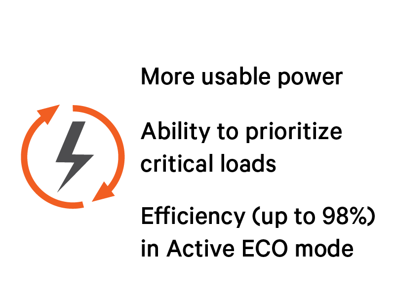 Reliable online double conversion topology isolates connected equipment from utility power disturbances while providing top of the line voltage/frequency regulation and surge protection. It is generator-friendly with zero transfer time and features an internal automatic bypass.