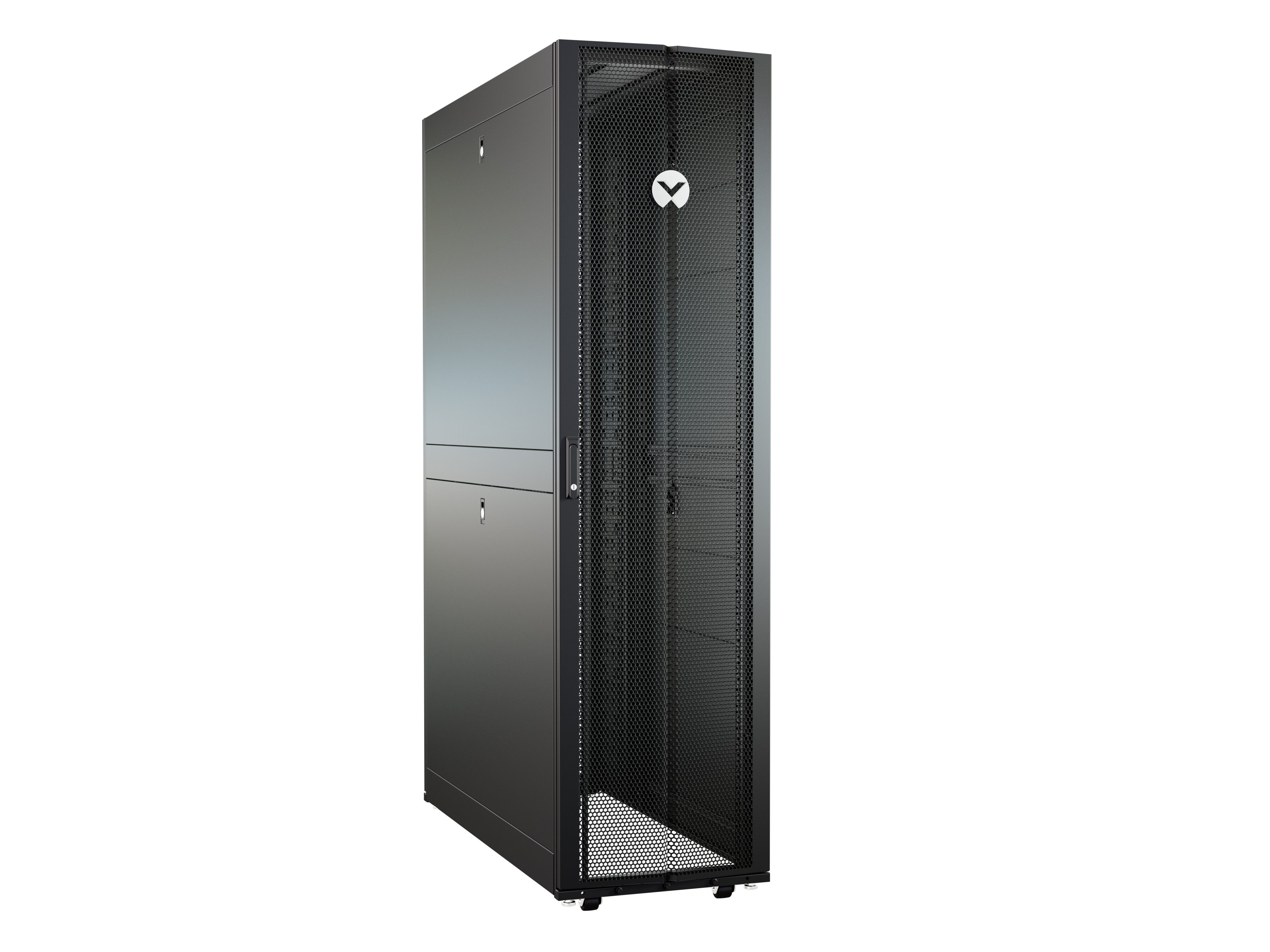 All Vertiv™ Racks come complete with keys and a hardware kit that includes 50 M6 cage nuts and screws, a cage nut installation tool, edge protection for top panel cable entry, a T30 / Phillips L key and T30 extension driver. All models feature a single 77% perforated locking front door, split 77% perforated locking rear doors, two pairs of split locking side panels, a high-density cable entry top cover (2000 Cat 6 cables), two sets of 19” EIA rails and two full height rack PDU Mounting /cable management brackets (one per side). The Vertiv™ Rack is built with low-profile casters and leveling feet, baying brackets and bolt-down brackets. VRXXXXSP ship with 2000 lb. rated shock packaging VRXXXXTAA are TAA Compliant *Nominal dimensions, reference submittal drawings for exact dimensions