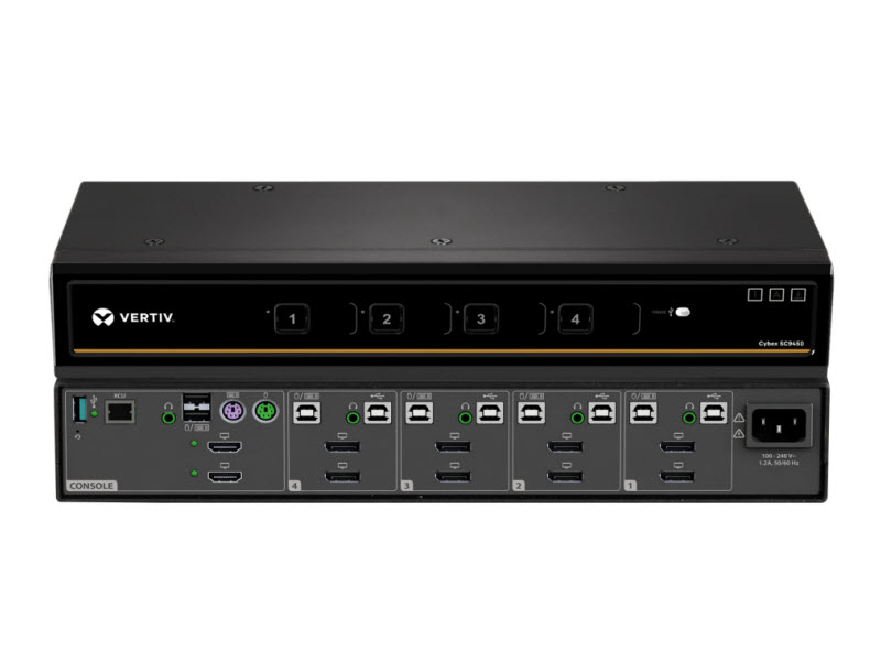 The Cybex™ SC945D secure desktop KVM is designed to meet the stringent specifications of the U.S. government and certified to the NIAP / Common Criteria Protection Profile for Peripheral Sharing Switch version 3.0.