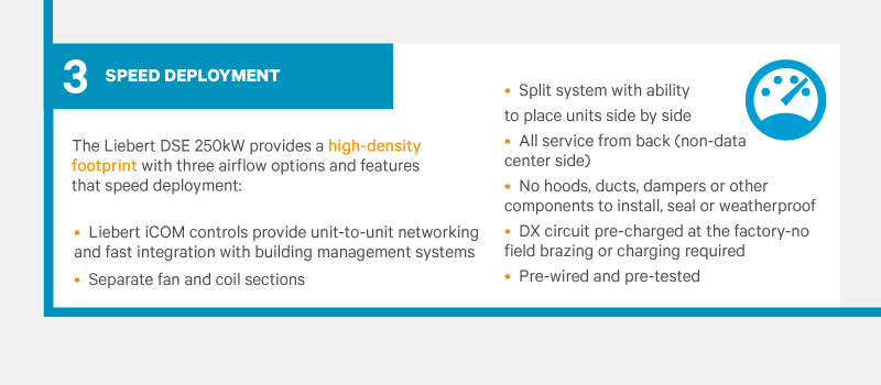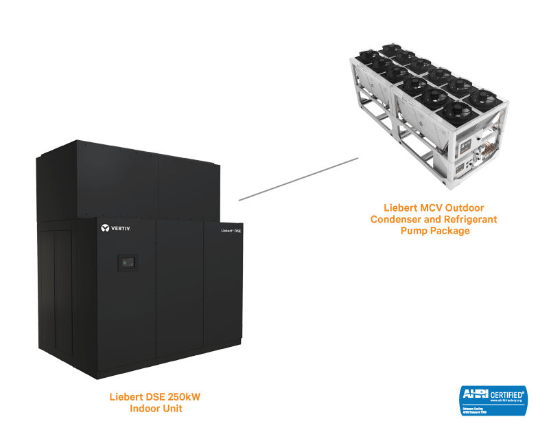 The Liebert® DSE™ Freecooling System is the world's most efficient and reliable water-free cooling system for data centers. The Liebert DSE 250kW split-system is highly efficient, uses no water, is rapidly deployable and has an attractive total cost of ownership. It uses the proven pumped refrigerant economization technology from Vertiv deployed in more than 4,000 installations worldwide.