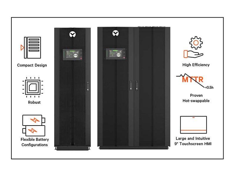 • Available Power Capacity- 10-150kVA 208/220V and 20-600kVA 480/415V • Available in 4-wire configuration for 208/220V and for 415V. Available in 3 or 4-wire configuration for 480V • Remarkable double conversion efficiency up to 97.5% with unity output factor • Internal modular batteries available in either VRLA or Lithium-Ion • Large, intuitive 9-inch full-color touchscreen HMI with real-time waveform monitoring and predictive maintenance notifications • Seamlessly operates up to 50°C with auto-derating above 40°C • Supports self-capacity test • ENERGY STAR qualified