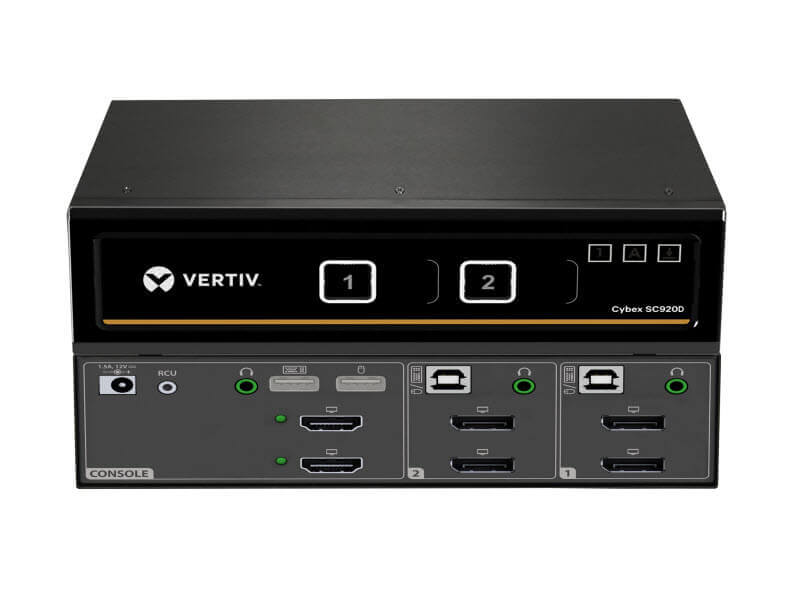 The Cybex™ SC920D secure desktop KVM is designed to meet the stringent specifications of the U.S. government and certified to the NIAP / Common Criteria Protection Profile for Peripheral Sharing Switch version 3.0.