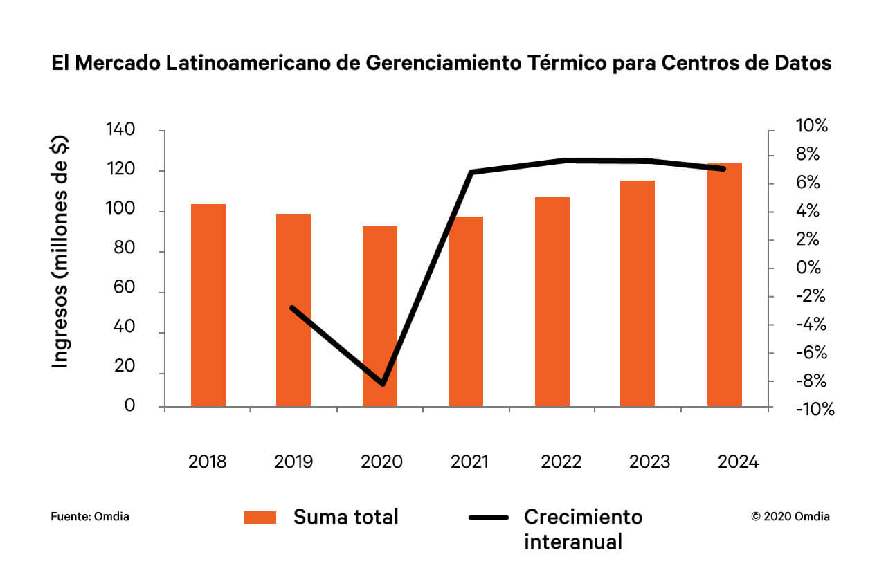 Lucas Beran, analista principal de la práctica de investigación de centros de datos y nube de Omdia y autor del informe, dijo: “El mercado del gerenciamiento térmico para centros de datos se encuentra en la antesala de un punto de inflexión. Actualmente, las soluciones y los productos térmicos basados en aire existentes están impulsando el crecimiento, pero están limitados por su capacidad para enfriar densidades de racks superiores a 10 kW. Hay nuevas tecnologías, productos y diseños en el mercado, que ayudarán a soportar estas implementaciones de alta densidad y operaciones más eficientes que llevarán a una mayor dinámica en el mercado hasta el 2024”.