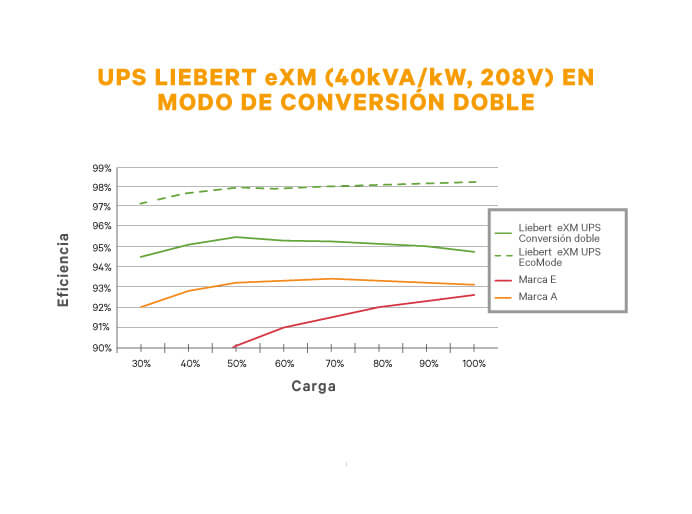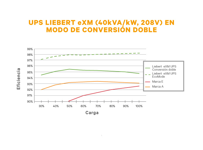 El factor de potencia unitario garantiza más potencia en un espacio más pequeño, lo cual aumenta la capacidad del sistema, minimiza el cableado y los costos de instalación. Alcanza una alta eficiencia en todo el rango de capacidad Sistemas de 400 voltios. El diseño sin transformador de Emerson ahorra espacio, dinero, peso y costos de envío. Alcanza una eficiencia del 96% en doble conversión (modelos de 400V) y, del 99% en Eco-Mode™. Conexión inteligente en paralelo.