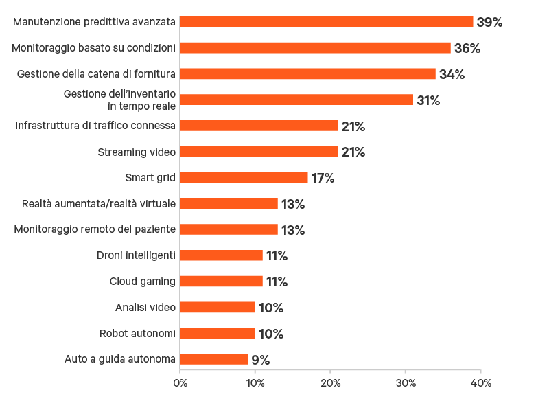 I più diffusi casi d’uso che hanno determinato investimenti nell’Edge sono la riduzione del tempo di inattività delle apparecchiature produttive e l’ottimizzazione della supply chain. La manutenzione predittiva rappresenta caso d'uso più citato dai partecipanti (39%); seguono la manutenzione basata sulle condizioni (36%), la gestione della supply chain (34%) e la gestione dell’inventario in tempo reale (31%) (Figura 8).