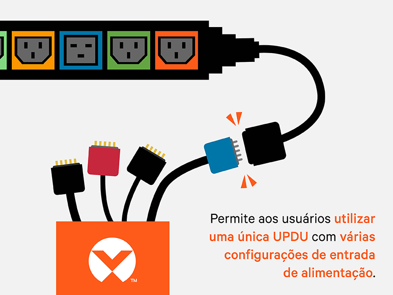 A UPDU é uma unidade de distribuição de energia para racks versátil, com uma entrada de alimentação universal e um Cabo FSC (vendido separadamente) e compatível com alimentação CA comum, variando de 16A a 60A e de 120V a 415V. Disponível em modelos básicos ou inteligentes com avançado monitoramento remoto de energia, ambiental e chaveamento opcional no nível das tomadas. Ela simplifica as implementações da infraestrutura crítica de TI ao permitir que um único modelo seja instalado no mundo todo.