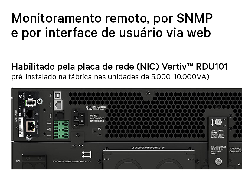 | 10.000 VA / 10.000 W | Típica: 208VAC / Faixa: 176-280VAC | 208/120VAC (configurável pelo usuário) | Até 98% no modo ECO Ativo; até 95% no modo on-line | Entrada/Saída com fios; PODs opcionais disponíveis | 10.2 in | 16.9 in | 25.6 in | 224.8 lb |